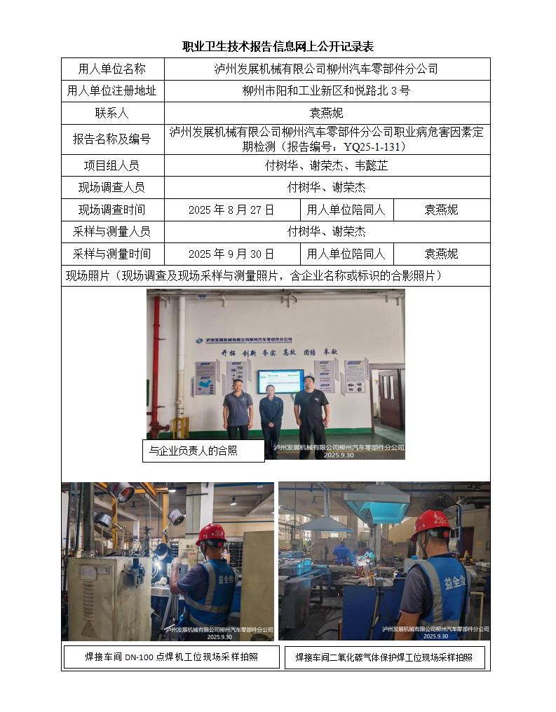 瀘州發(fā)展機(jī)械有限公司柳州汽車零部件分公司職業(yè)病危害因素定期檢測(cè)