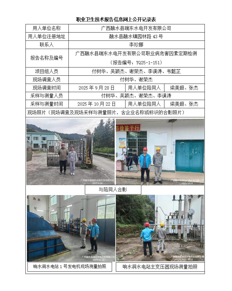 廣西融水縣瑞東水電開發(fā)有限公司職業(yè)病危害因素定期檢測 (報告編號:YQ25-1-151)