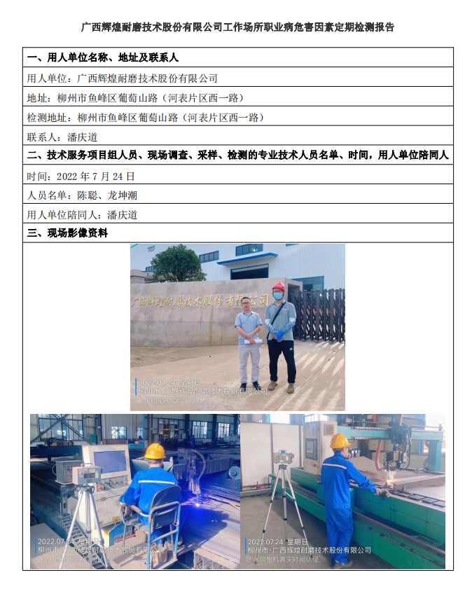 廣西輝煌耐磨技術(shù)股份有限公司工作場所職業(yè)病危害因素定期檢測報告
