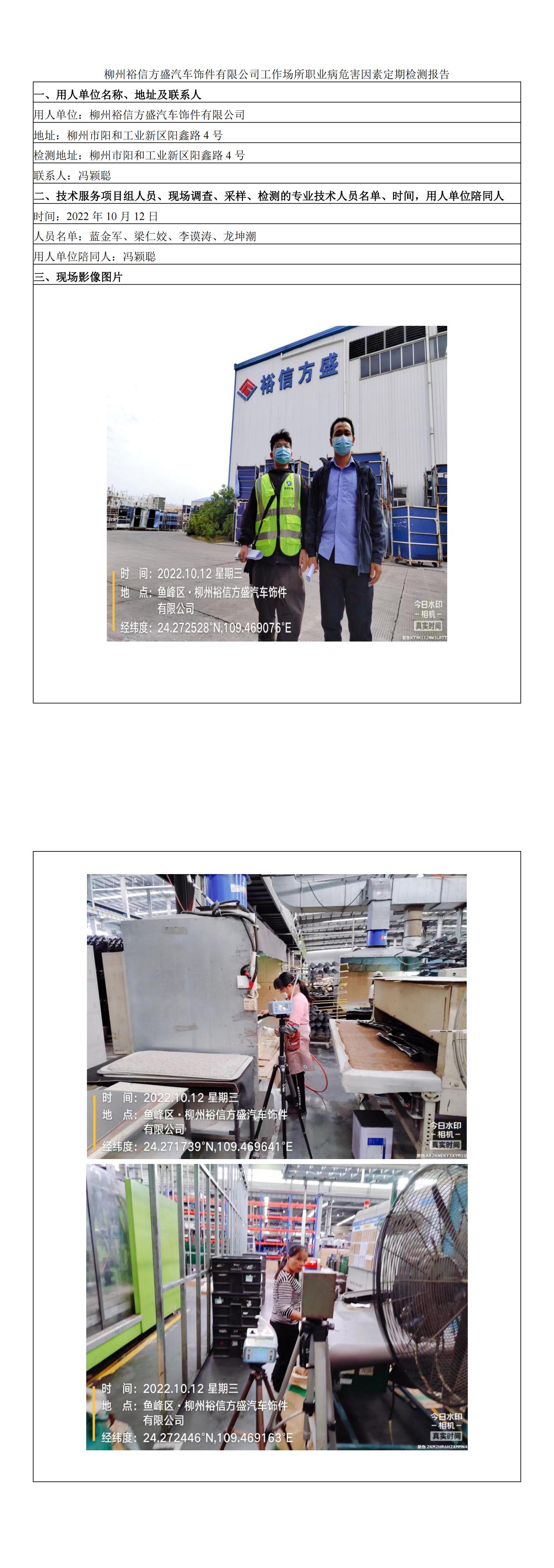 柳州裕信方盛汽車飾件有限公司工作場所職業(yè)病危害因素定期檢測報告
