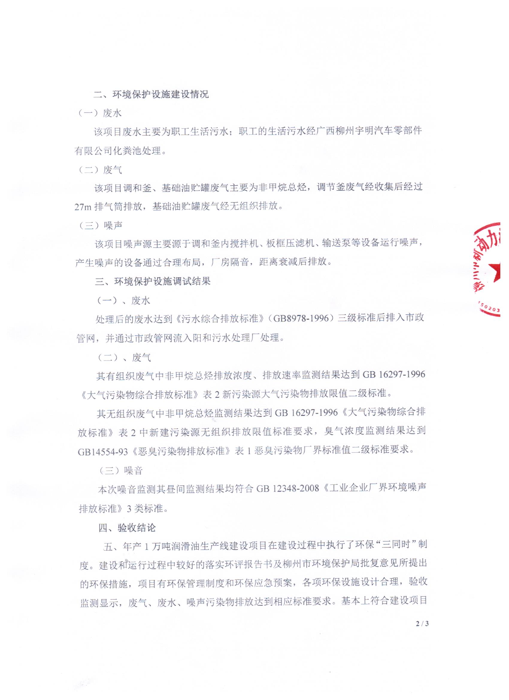 根據(jù)《關(guān)于發(fā)布<建設(shè)項目竣工環(huán)境保護驗收暫行辦法>的公告》(國環(huán)規(guī)環(huán)評〔2017〕4號)要求,除按照國家規(guī)定需要保密的情形外,建設(shè)項目單位應(yīng)依法向社會公示驗收報告。為此,柳州市新動力潤滑油有限公司將《年產(chǎn)1萬噸潤滑油生產(chǎn)線建設(shè)項目(廢氣、廢水、噪聲)竣工環(huán)境保護驗收監(jiān)測報告表》及項目驗收意見進行公示公開,公開內(nèi)容為報告全文本信息。
