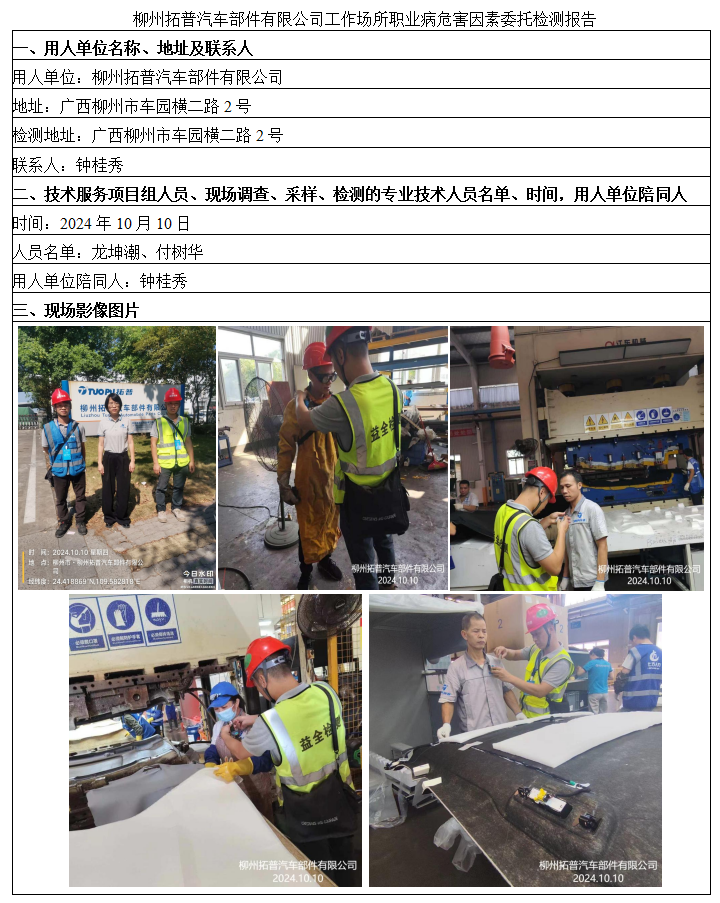 柳州拓普汽車部件有限公司工作場所職業(yè)病危害因素委托檢測報告