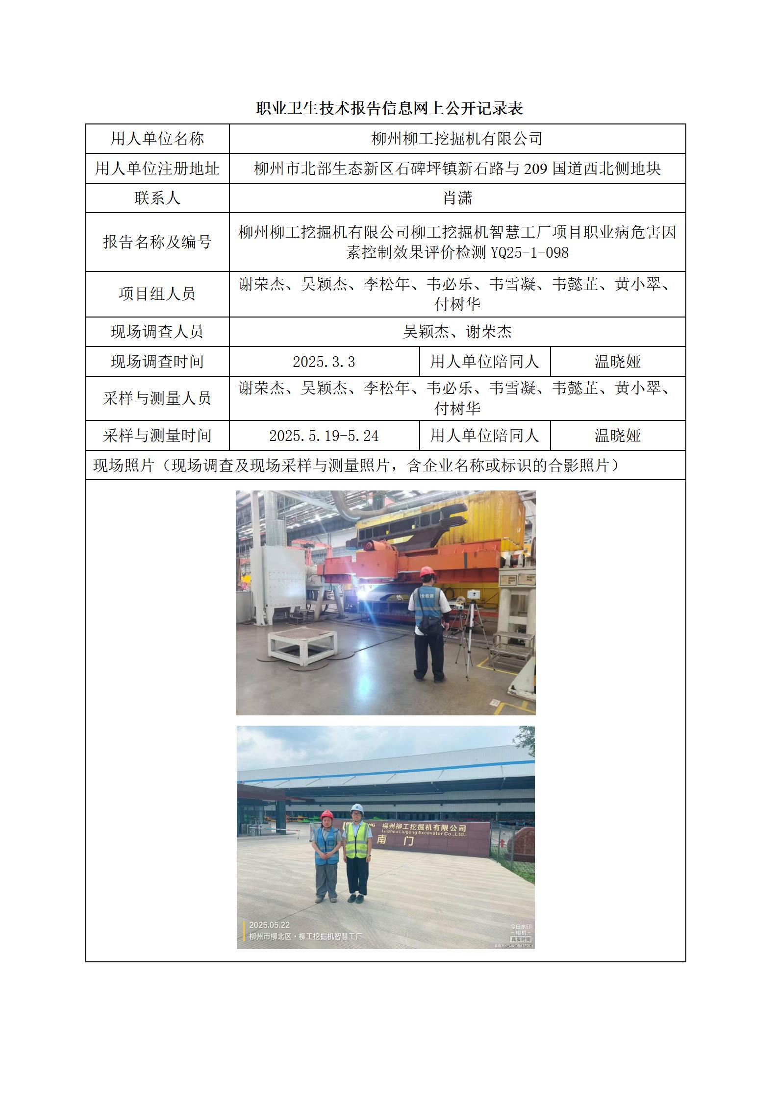 柳州柳工挖掘機有限公司柳工挖掘機智慧工廠項目職業(yè)病危害因素控制效果評價檢測報告