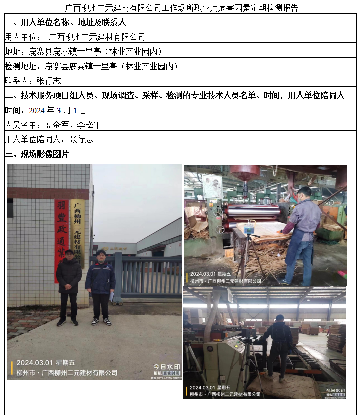 廣西柳州二元建材有限公司工作場所職業(yè)病危害因素定期檢測報告