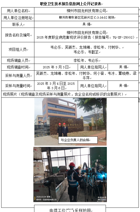 柳州市回龍科技有限公司 2025年度職業(yè)病危害現(xiàn)狀評(píng)價(jià)報(bào)告