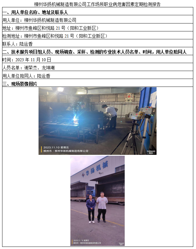 柳州華揚(yáng)機(jī)械制造有限公司工作場所職業(yè)病危害因素定期檢測報告