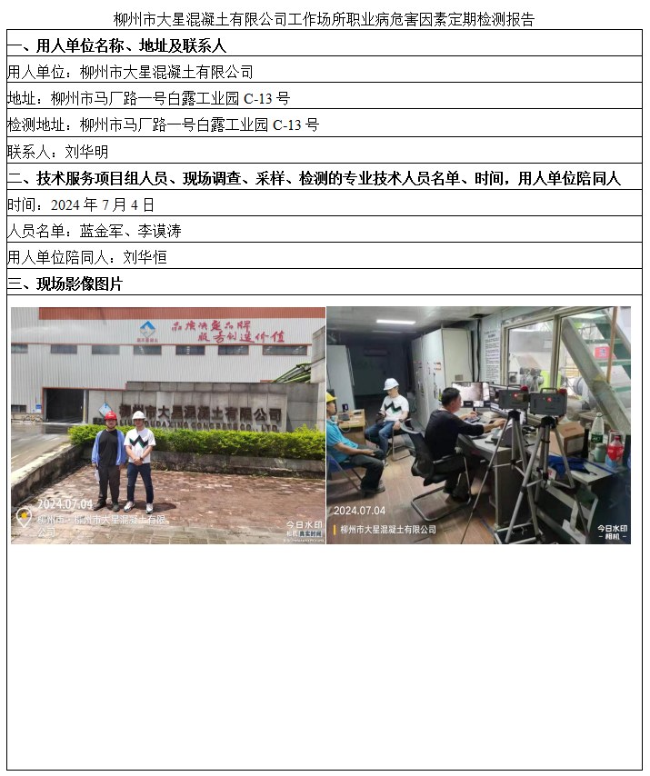 柳州市大星混凝土有限公司工作場所職業(yè)病危害因素定期檢測報告