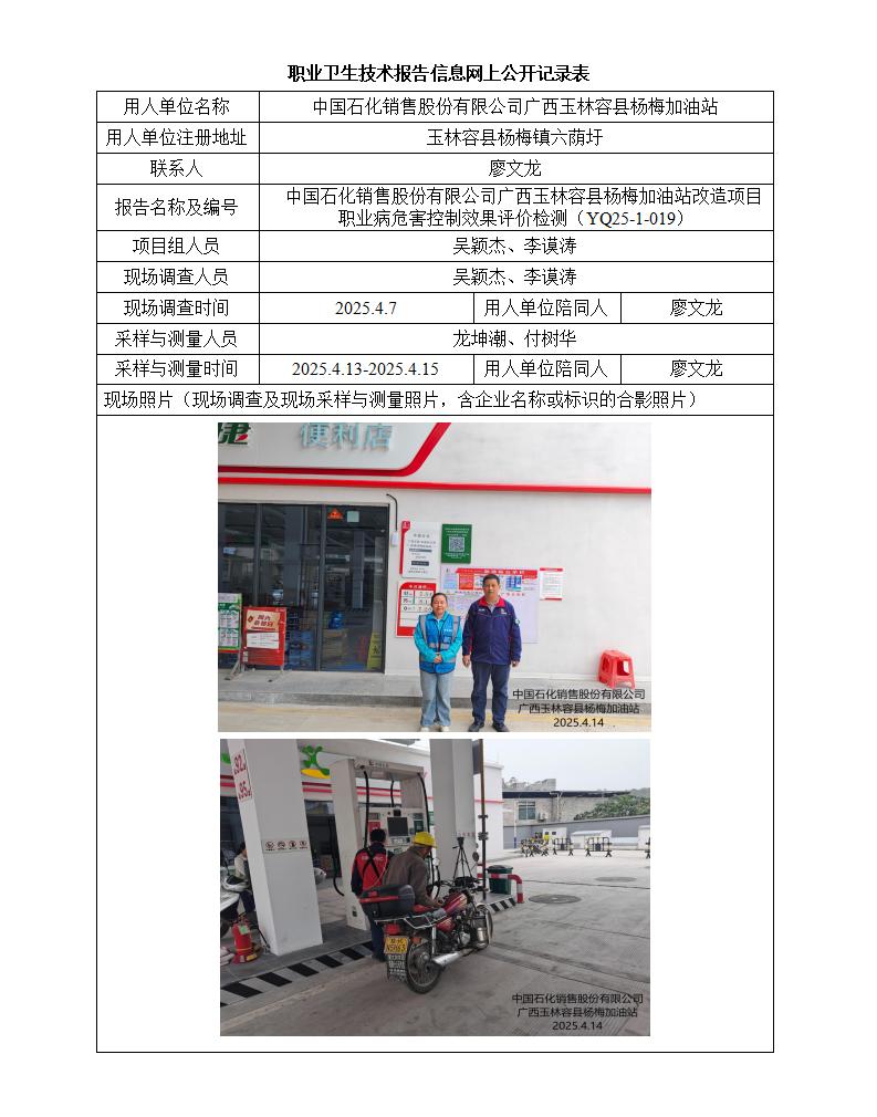 中國石化銷售股份有限公司廣西玉林容縣楊梅加油站改造項(xiàng)目職業(yè)病危害控制效果評(píng)價(jià)檢測(cè)