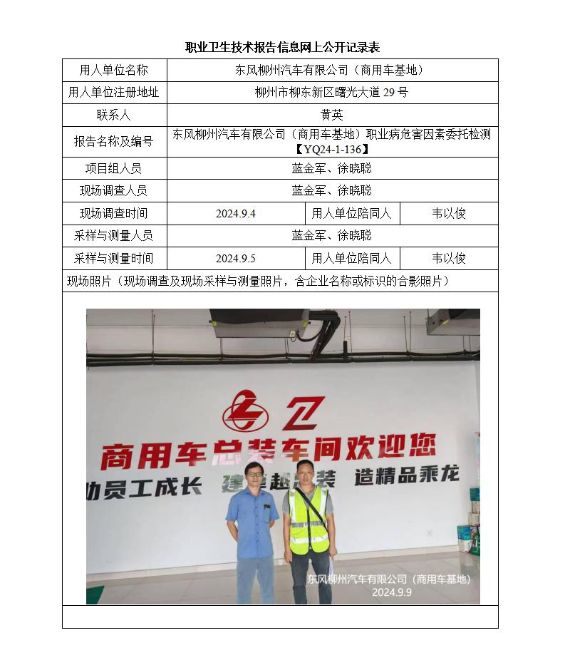 東風(fēng)柳州汽車有限公司(商用車基地)職業(yè)病危害因素委托檢測報(bào)告