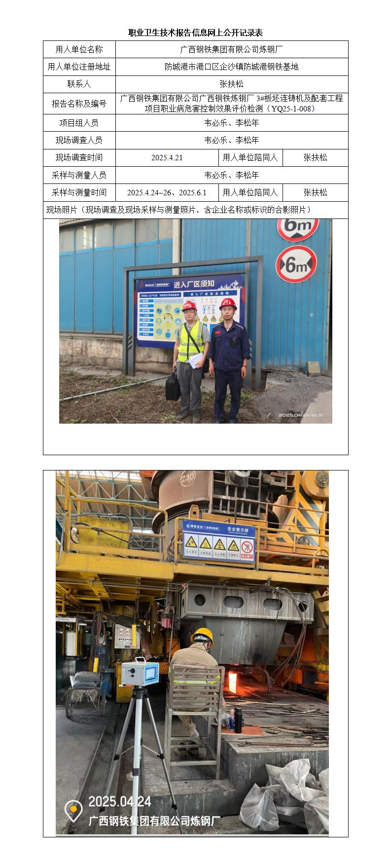 廣西鋼鐵集團(tuán)有限公司廣西鋼鐵煉鋼廠3#板坯連鑄機(jī)及配套工程項目職業(yè)病危害控制效果評價檢測