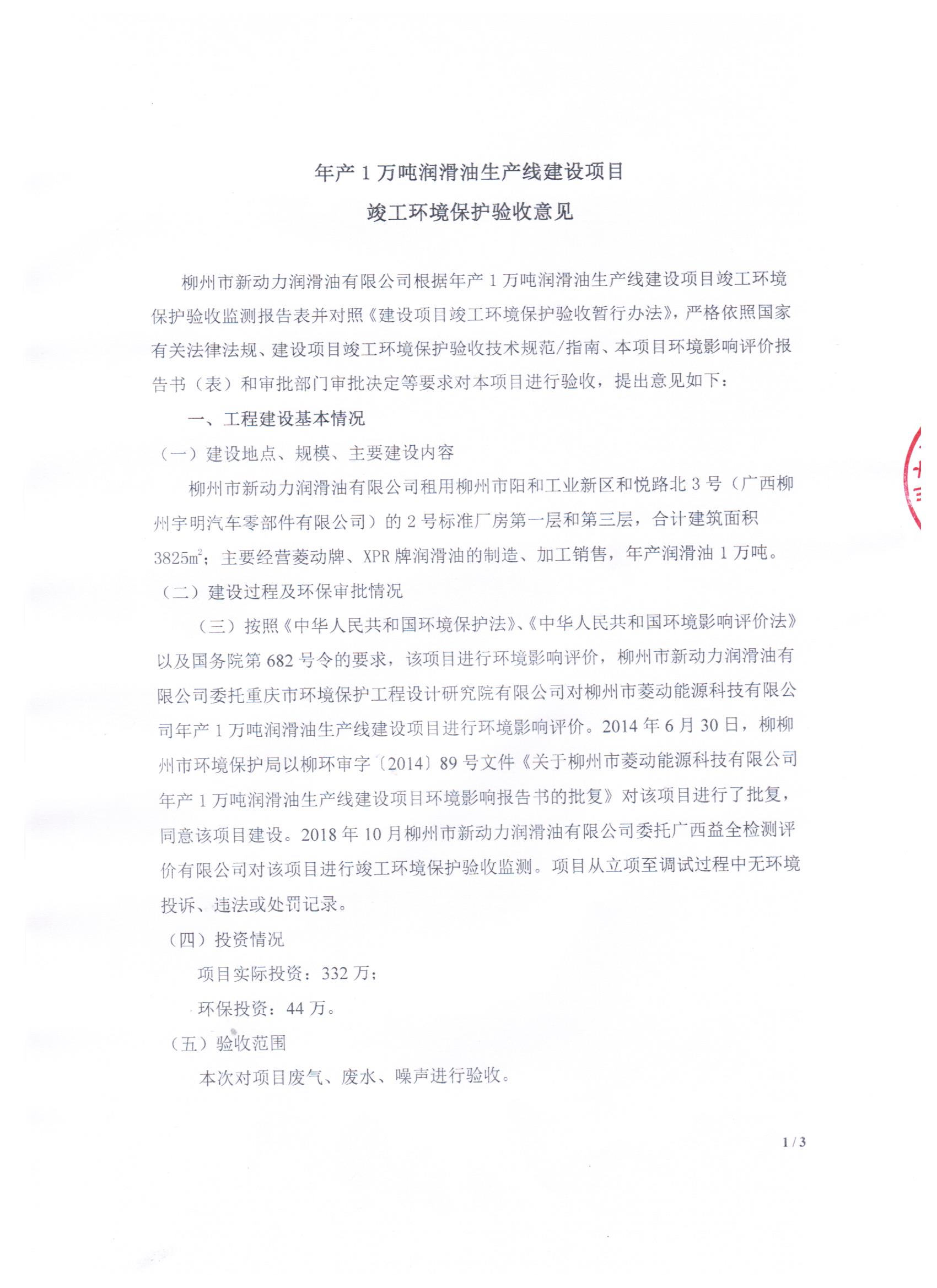 柳州市新動力潤滑油有限公司年產(chǎn)1萬噸潤滑油生產(chǎn)線建設(shè)項目(廢氣、廢水、噪聲)竣工環(huán)境保護驗收監(jiān)測報告表及項目驗收意見進行公示公開