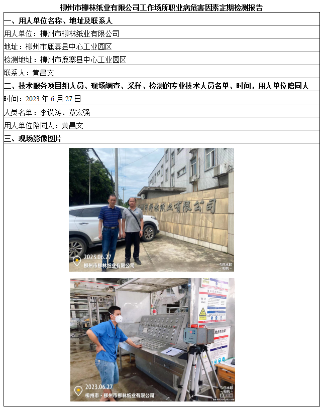 柳州市柳林紙業(yè)有限公司工作場所職業(yè)病危害因素定期檢測報告