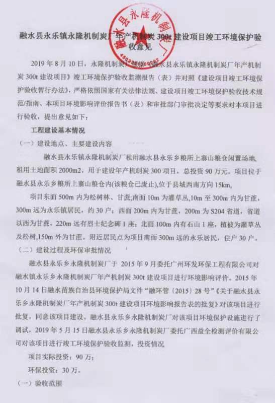 融水縣永樂鎮(zhèn)永隆機(jī)制炭廠年產(chǎn)機(jī)制炭300t建設(shè)項(xiàng)目(廢氣、廢水、噪聲)竣工環(huán)境保護(hù)驗(yàn)收監(jiān)測(cè)報(bào)告表及項(xiàng)目驗(yàn)收意見進(jìn)行公示公開