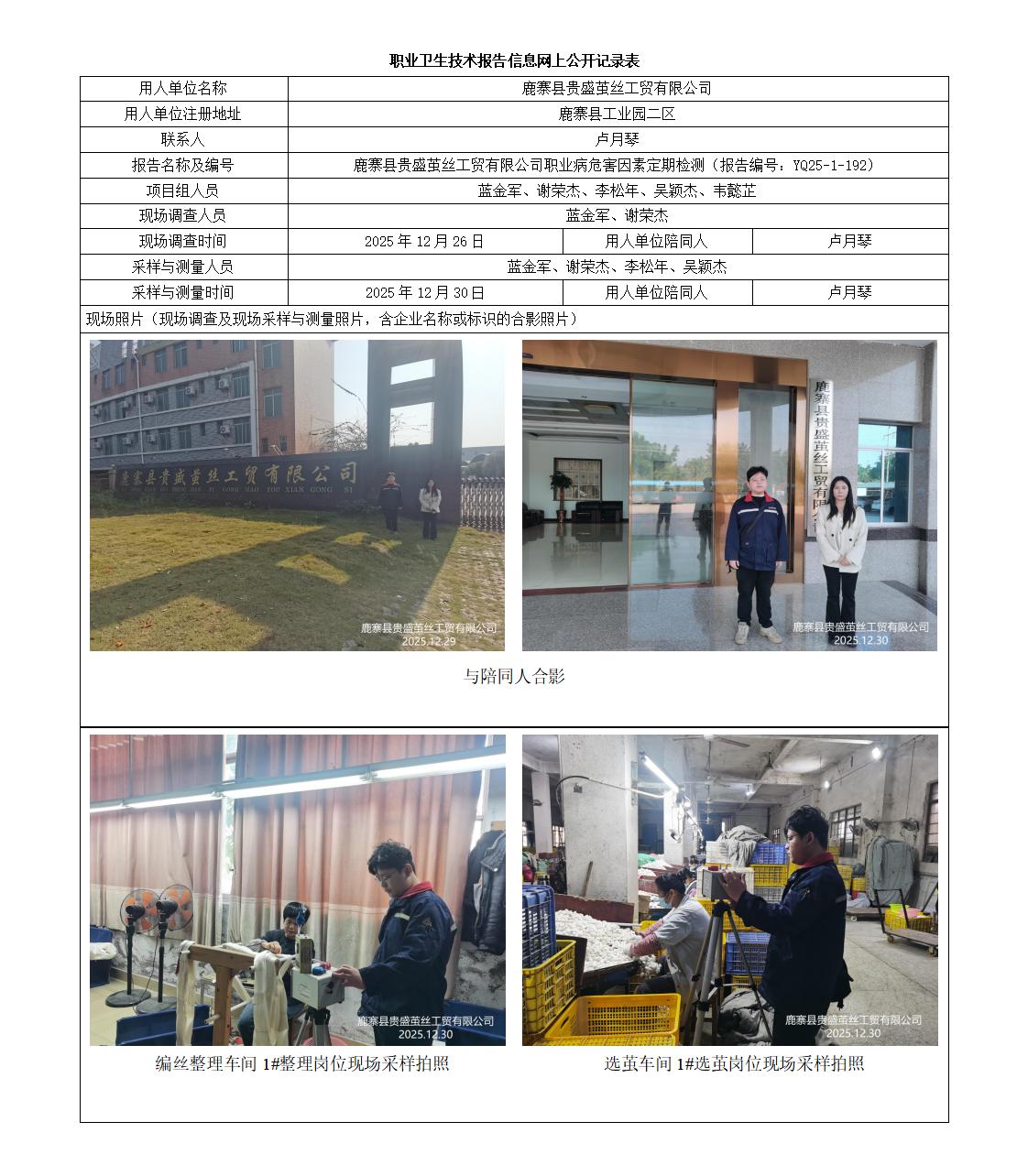 鹿寨縣貴盛繭絲工貿(mào)有限公司職業(yè)病危害因素定期檢測(cè)(報(bào)告編號(hào):YQ25-1-192)