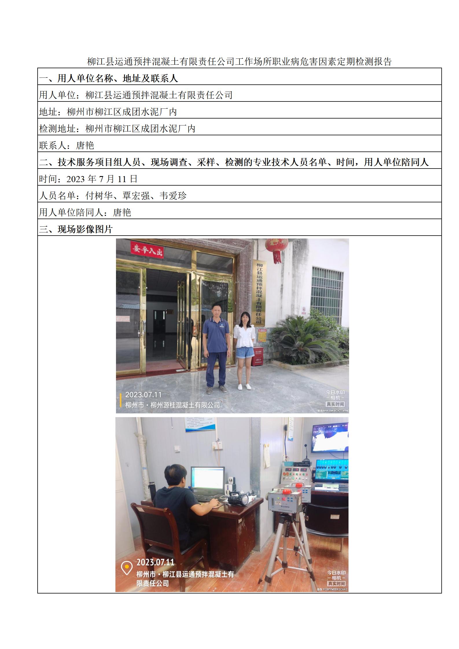柳江縣運(yùn)通預(yù)拌混凝土有限責(zé)任公司工作場(chǎng)所職業(yè)病危害因素定期檢測(cè)報(bào)告