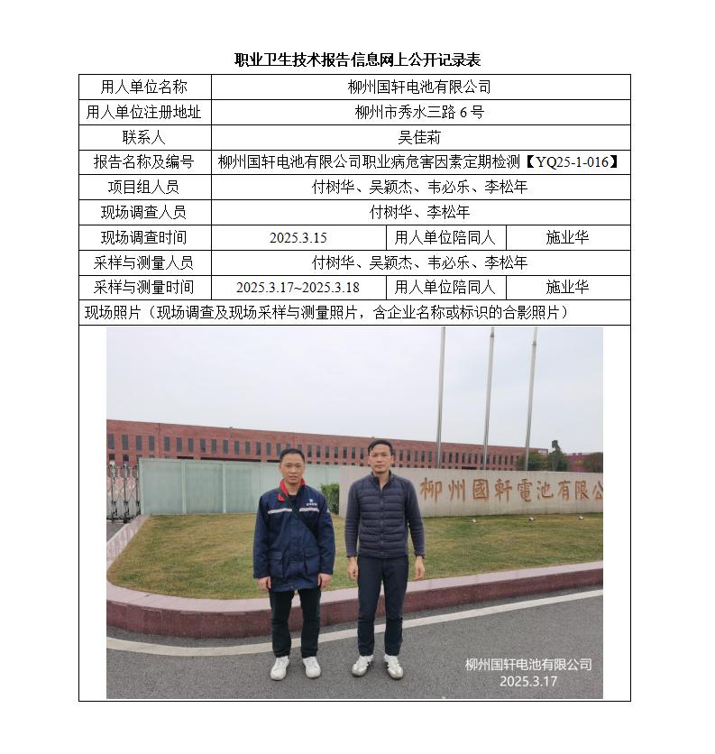 柳州國軒電池有限公司職業(yè)病危害因素定期檢測報告